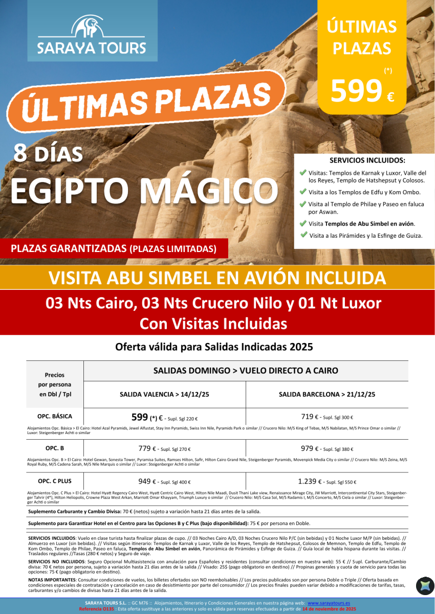 Últimas Plazas Egipto Mágico con Abu Simbel en avión Incluido desde Vlc & Bcn. Consultar fechas.