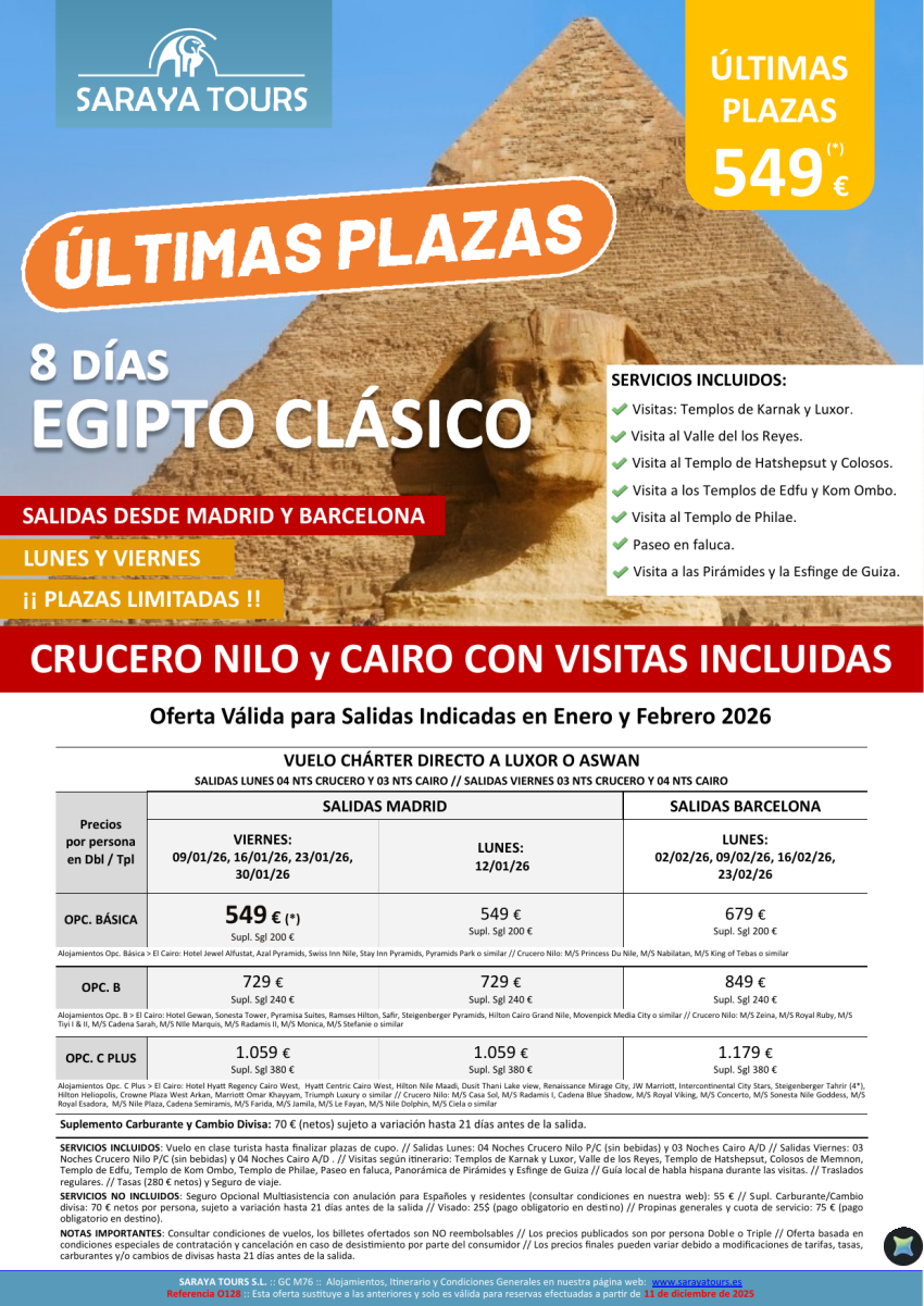 Últimas Plazas Egipto Clásico 8 días. Viernes y Lunes. Crucero y Cairo con Visitas. Desde 549 €